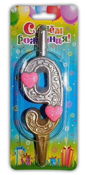 БР 3057 Свеча для торта "Цифра 9" Цвет: Золото/ серебро с сердечками