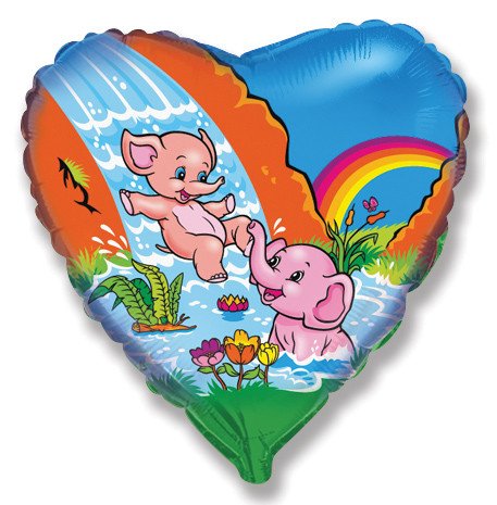 1260849 (БР 201592) Фольгир.сердце "Веселые слоники на водопаде" Диаметр 48 см.