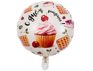 ВЗ 1202-2927 Фольгированный круг "С Днем рождения! Капкейк с вишенкой" D 45 см. (с гелием)