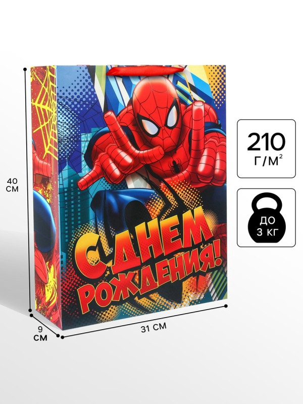 1120632 Пакет темно синий "С Днем рождения! Человек Паук" Размер 31 х 40 см. Вертикальный