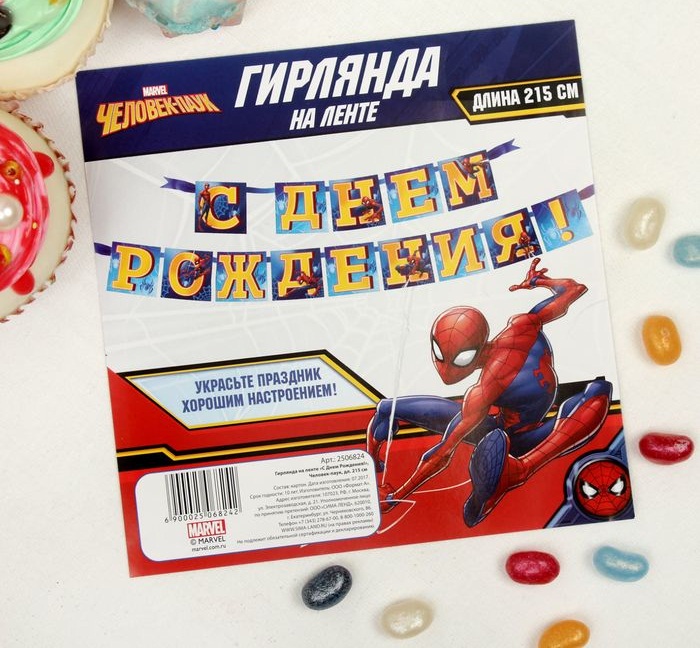 2506824 Гирлянда на ленте "С Днем рождения! Человек Паук" Длина 215 см.