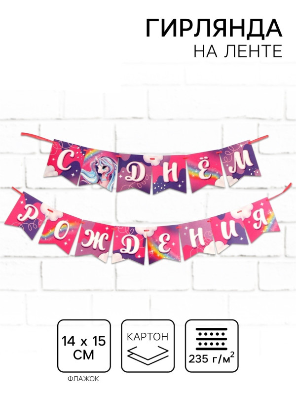 9870593 Гирлянда на ленте "С Днем рождения! Единорог" Размер одного флажка 14 х 15 см.