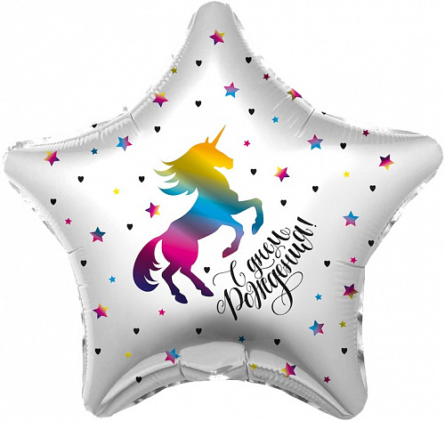 АГ 757789 Фольгированная белая звезда "С Днем рождения! Радужный единорог" D 45 см.