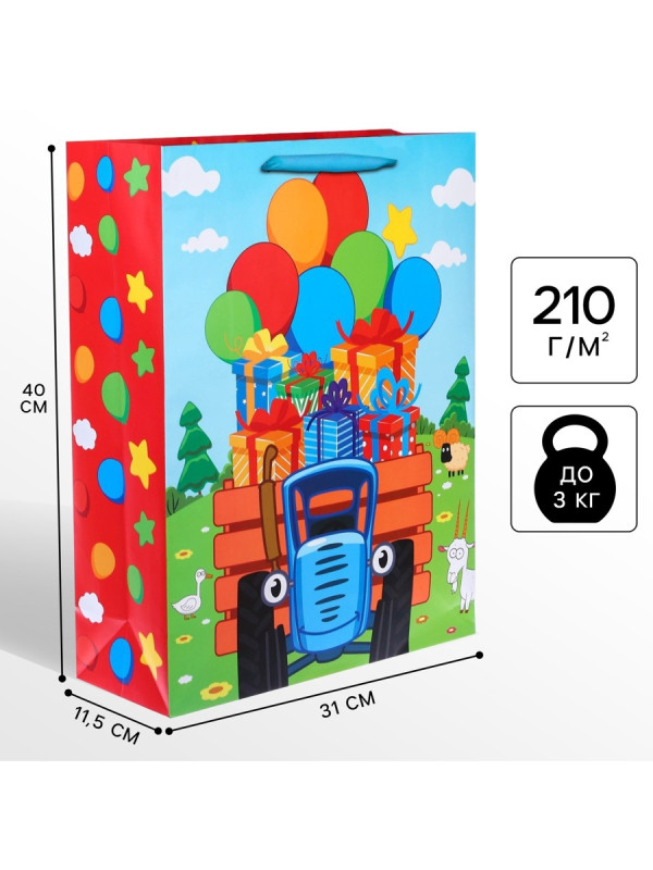 9240287 Пакет голубой "С Днем рождения! Синий трактор" Размер 31 х 40 см. Вертикальный
