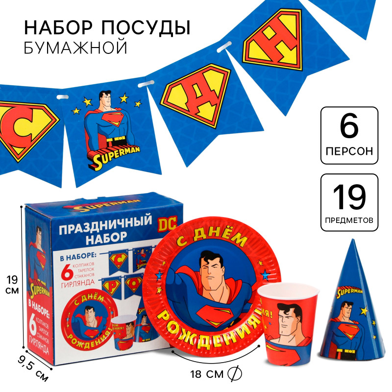 9363820 Набор бумажной посуды "Супермен" на 6 персон:стаканы, тарелки, колпаки и гирлянда