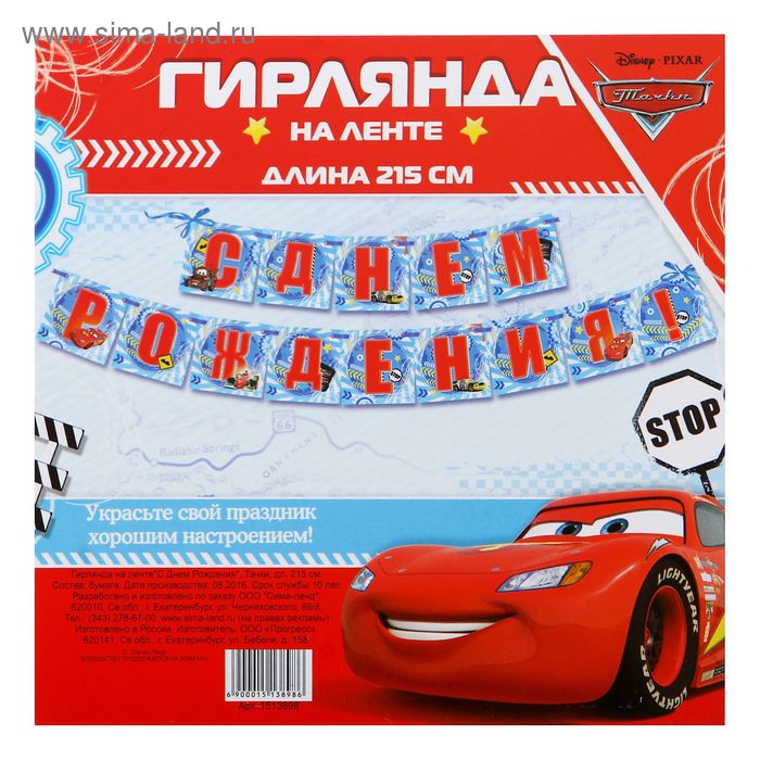 1513898 Гирлянда на ленте "С Днем рождения! Тачки" Длина 215 см.