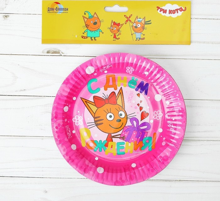 3468416 (ДБ 6014889) Набор розовых тарелок "С Днем рождения! Три кота" (6 шт.) Диаметр 18 см.