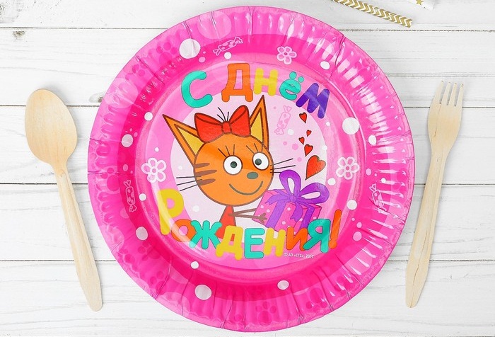 3468419 (ДБ 6014888) Набор розовых тарелок "С Днем рождения! Три кота" (6 шт.) Диаметр 23 см.