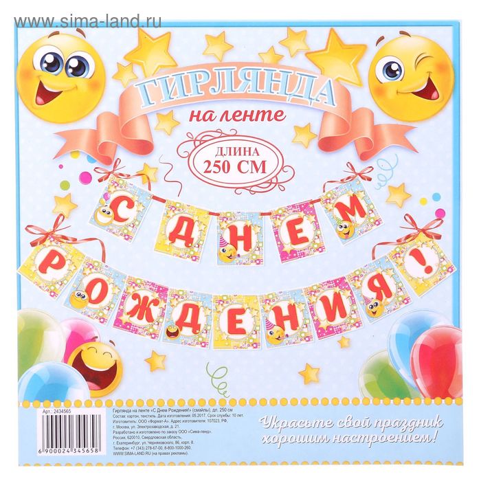 2434565 Гирлянда на ленте "С Днем рождения! Смайлы" Длина 250 см.