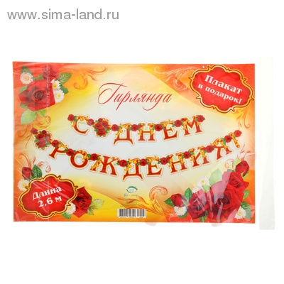 860042 Гирлянда "С Днем рождения.Розы красные" Длина 2,6 м. Плакат в подарок