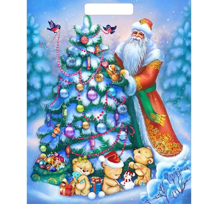 1606317 Пакет ПВД "Дед Мороз и мишутки около елки" Размер 30*40 см.Максим.вес 10 кг.