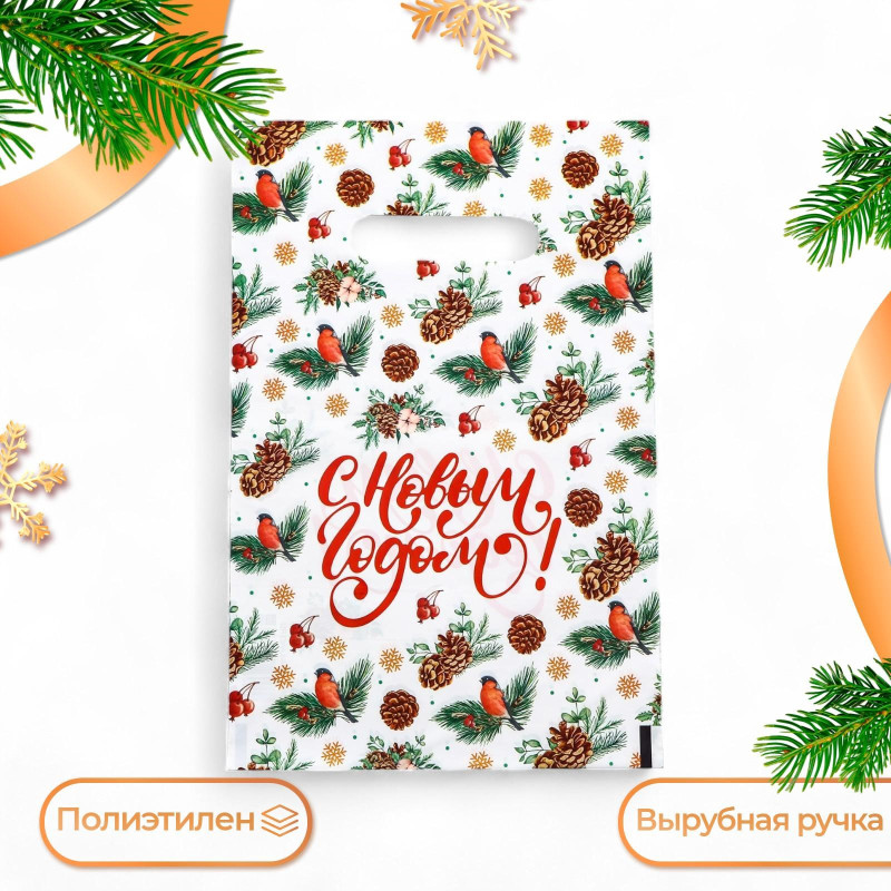 9748163 Белый пакет "С Новым годом! Снегири и шишки" Размер 20 х 30 см.