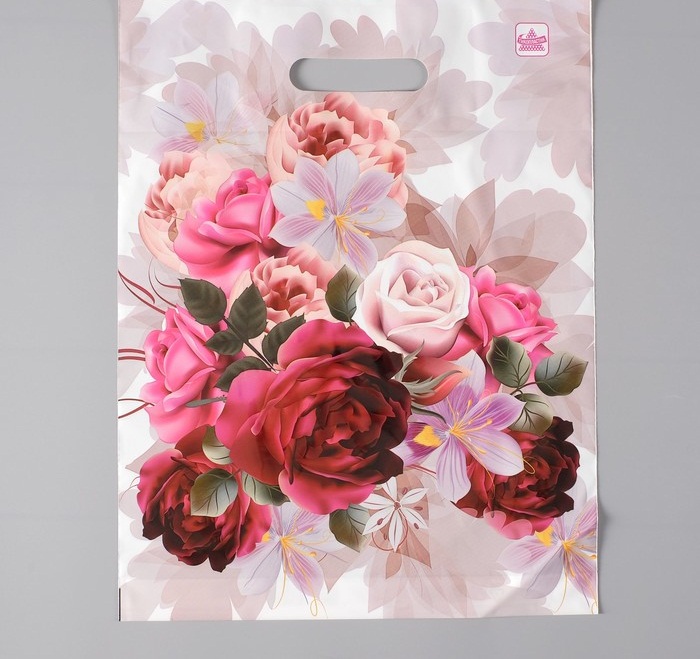 2143693 Пакет ПВД "Пионы на бежевом фоне" Размер 31*40 см. Плотность 55 мкм