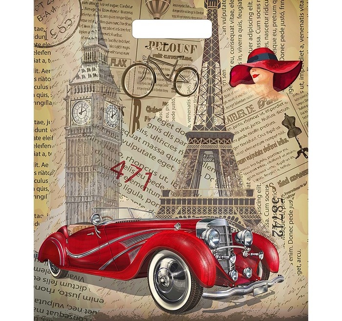 3285410 Пакет ПВД "Ретро газета и красный автомобиль" Размер 38*45 см. Мах.вес 5 кг