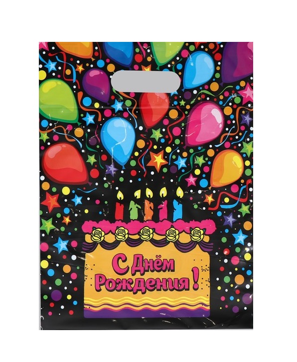 4200478 Пакет черный ПВД "С Днем рождения! Свечи и шарики" Размер 30 х 40 см. Плотность 55 мкм