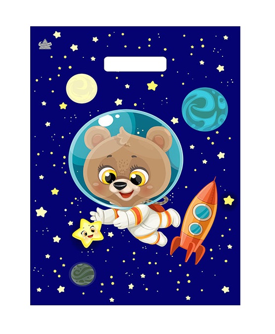 7669453 Пакет синий ПВД "Мишутка космонавт" Размер 30 х 40 см. Плотность 55 мкм