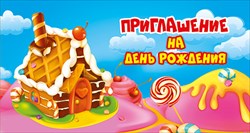097.358 Приглашение на детский день рождения "Сладкий домик" Тиснение блестками