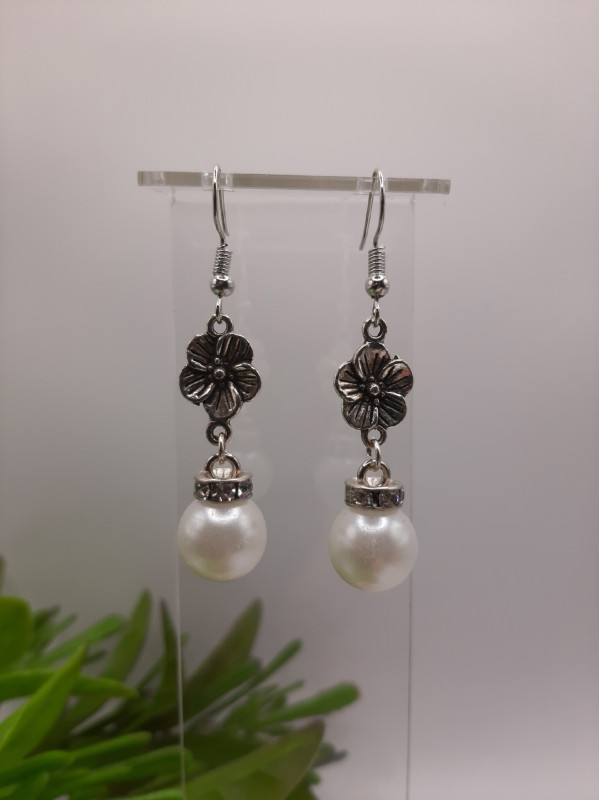 WW СР-22/6 Серьги "Цветочек с белой бусиной" (2 шт.) Цвет: серебро Длина 5,5 см.