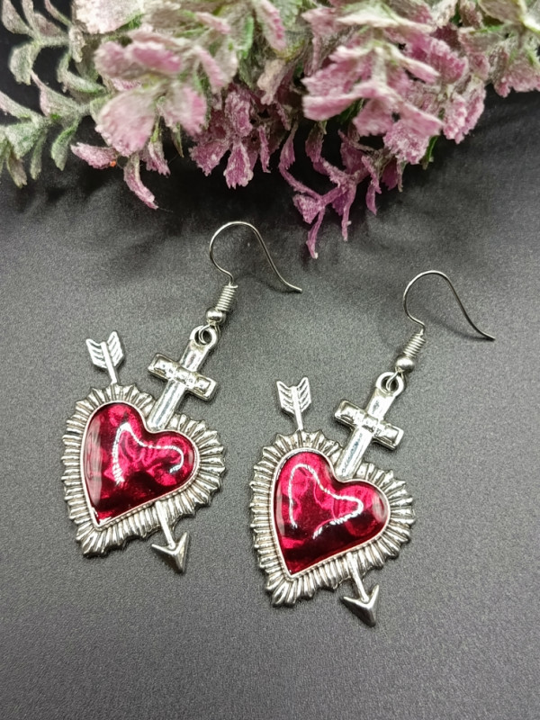 WW СР-25/22 Серьги "Красное сердце пронзенное стрелой" (2 шт.) Цвет:серебро