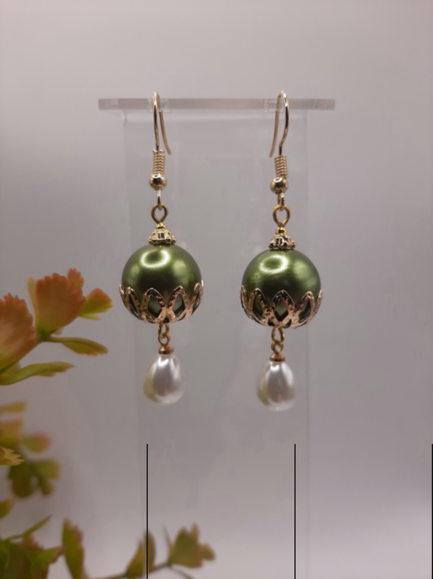 WW ЗЛ-23/11 Серьги "Зеленые камни с жемчугом" (2 шт.) Цвет: золото Длина 5,5 см.