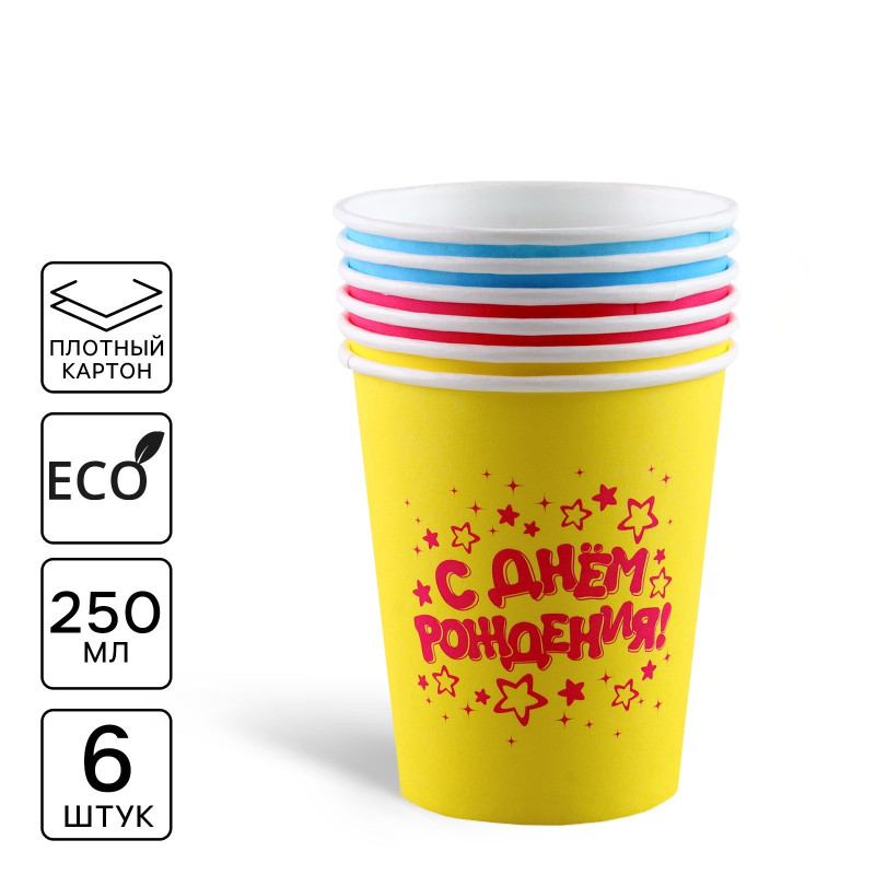 9380451 Набор стаканов "С Днем рождения!" (6 шт.) Цвета: розовый, желтый и синий