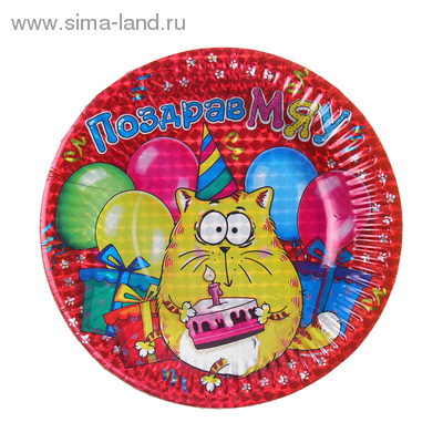876700 Набор голографических тарелок " ПоздравМЯУ" . Диаметр 18 см. (6 шт.)