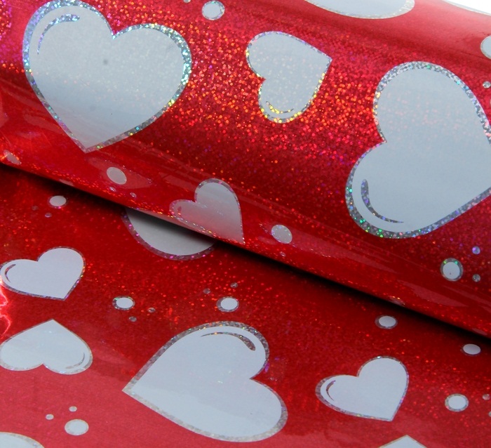 894937 Бумага голографическая "Белые сердца на красном" Размер 70*100 см.
